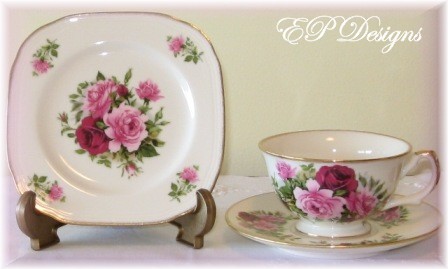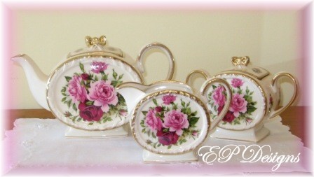 I’ll start with a vintage style, rose tea set. This teapot, creamer & sugar set will do nicely for our cyber tea.